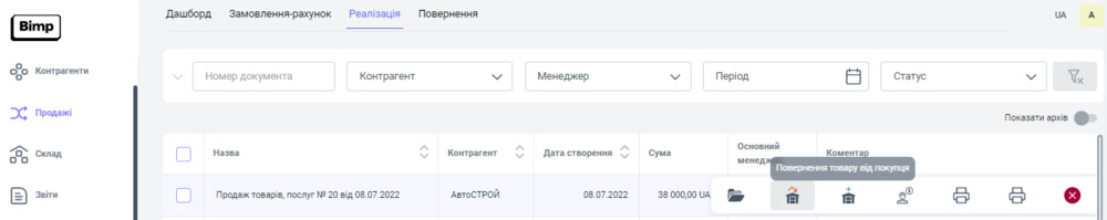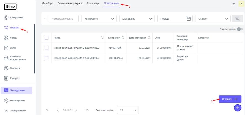 Або, ви можете створити цей документ через блок Продажі розділ Повернення, натиснувши на кнопку "Створити", а також