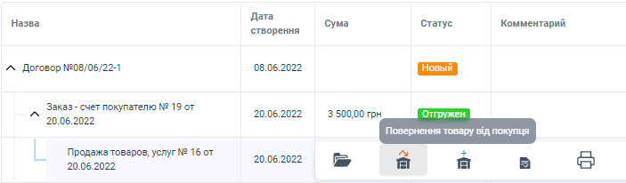 Перейшовши в його картку відкриваєте необхідний Проєкт (у випадку, коли ведете взаємодії з контрагентами на основі проєктів) і на основі Договору обираєте "Замовлення-рахунок покупцеві" на основі якого, ви створили раніше документ "Продаж товарів, послуг", і на його основі формуєте документ про повернення.