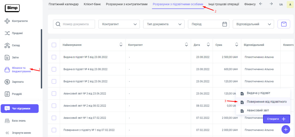 На сервісі Bimp, для того, щоб провести повернення коштів виданих раніше підзвітній особі (співробітнику), необхідно створити документ "Повернення від підзвітного".