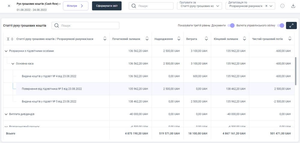 А також, дані з документа попадають у звіт — Рух грошових коштів.