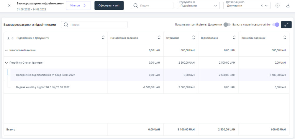 Дані з документа "Повернення від підзвітного" потрапляють у звіт — Взаєморозрахунки з підзвітниками.