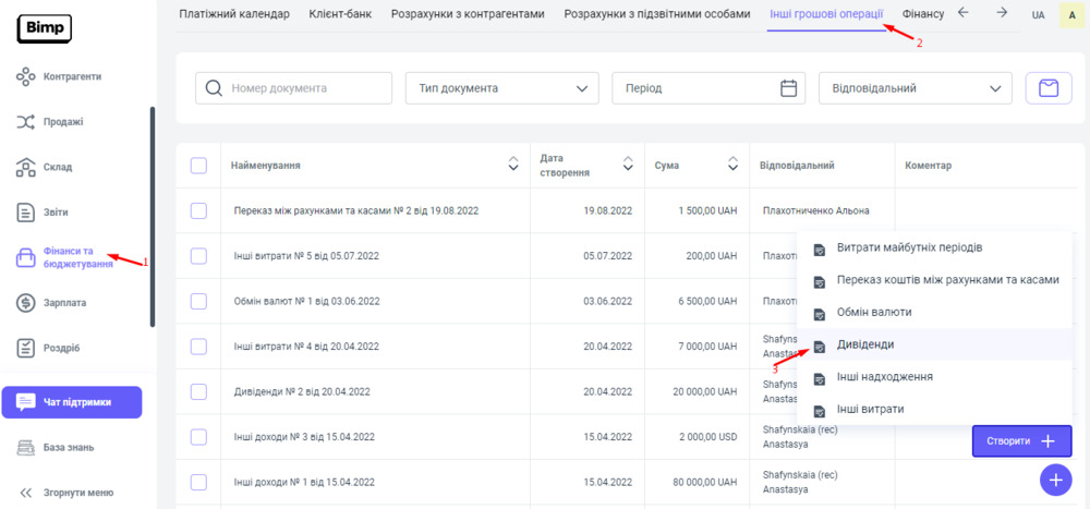 На сервісі Bimp, для того, щоб виплатити дивіденди власникам компанії, необхідно скористатися документом "Дивіденди".