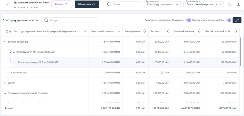 Після створення документа "Дивіденди" дані з нього потрапляють у звіт — Рух грошових коштів.
