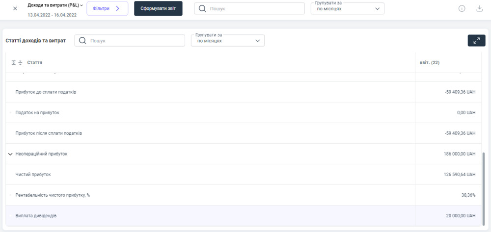 У звіті ми можемо побачити суму грошових коштів виплачених власнику, як дивіденди, у відповідному рядку звіту — Виплата дивідендів.