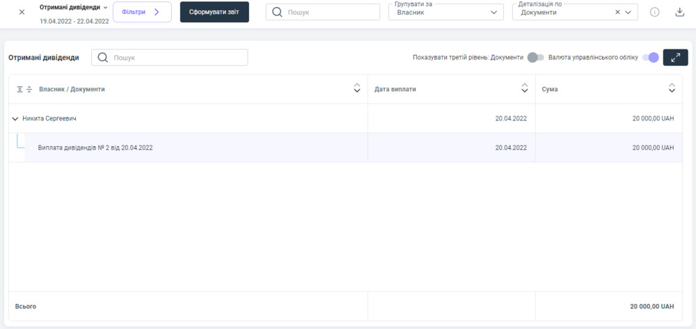 У звіті ми можемо побачити, котрому власнику було виплачено дивіденди, дату та суму грошових коштів, а також документ, яким була проведена дана операція.
