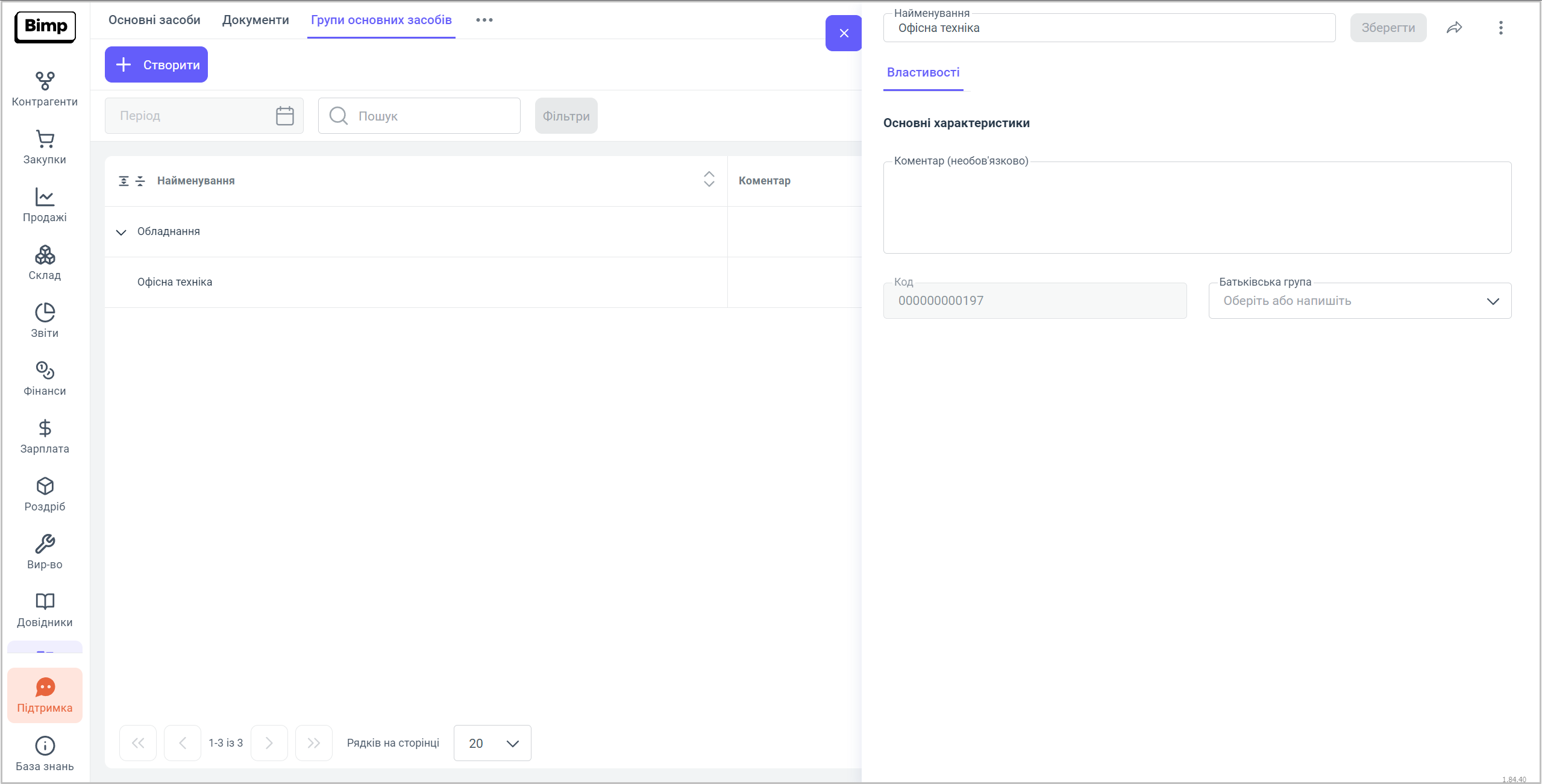У полі Основні характеристики - можливо внести дані про те, які основні засоби відносяться до цієї групи, або іншу необхідну вашій компанії інформацію.