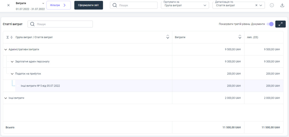Після створення документа "Інші витрати", дані з цього документа потрапляють у звіт — Доходи та витрати.