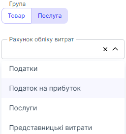 3. А також, вказуємо в рядку Група - "Послуга", а в рядку Рахунок обліку витрат обираємо із випадаючого списку статтю — Податок на прибуток.