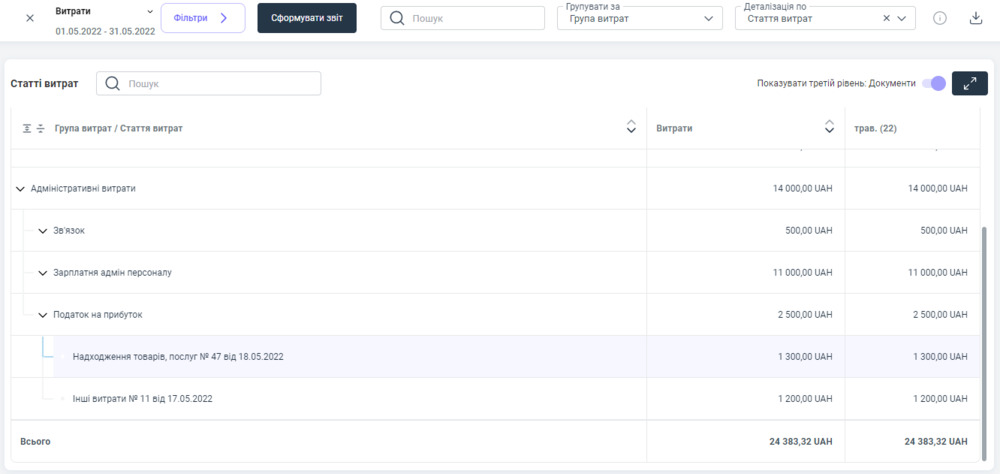 Після створення документів, дані з них потрапляють до звіту — Доходи та витрати.