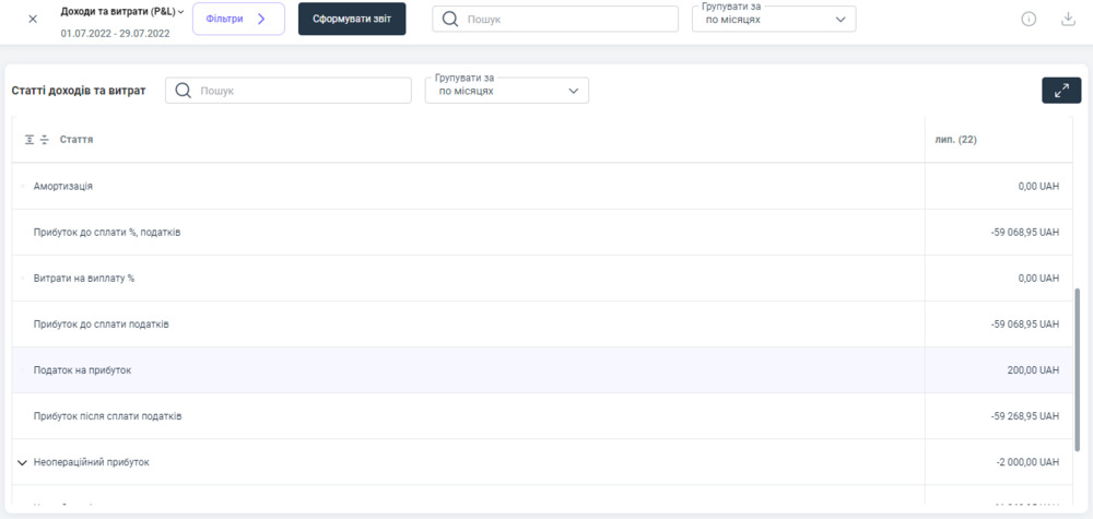 Після проведення надходження послуги за статтею витрати — Податок на прибуток, у звіті ми можемо побачити суму проведену ним у рядку звіту — Податок на прибуток.