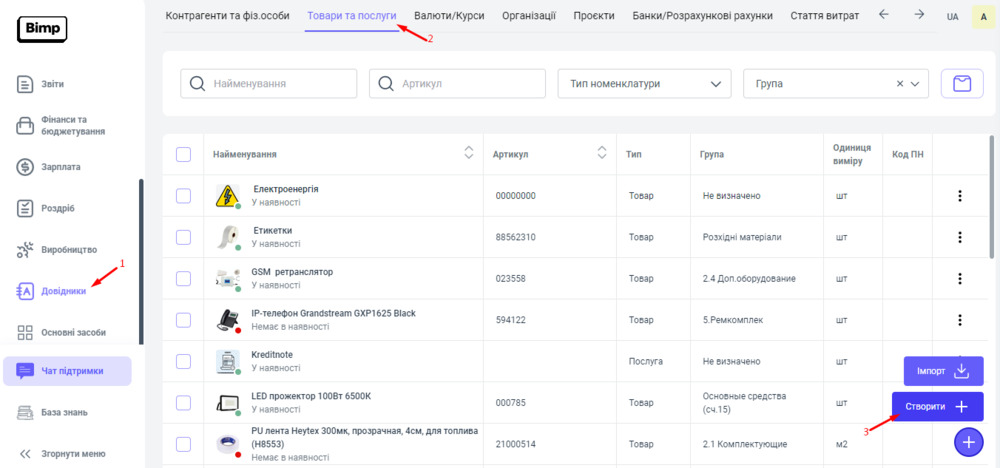 1. Створити картку номенклатури для послуги в блоці Довідники розділ Товари та послуги.