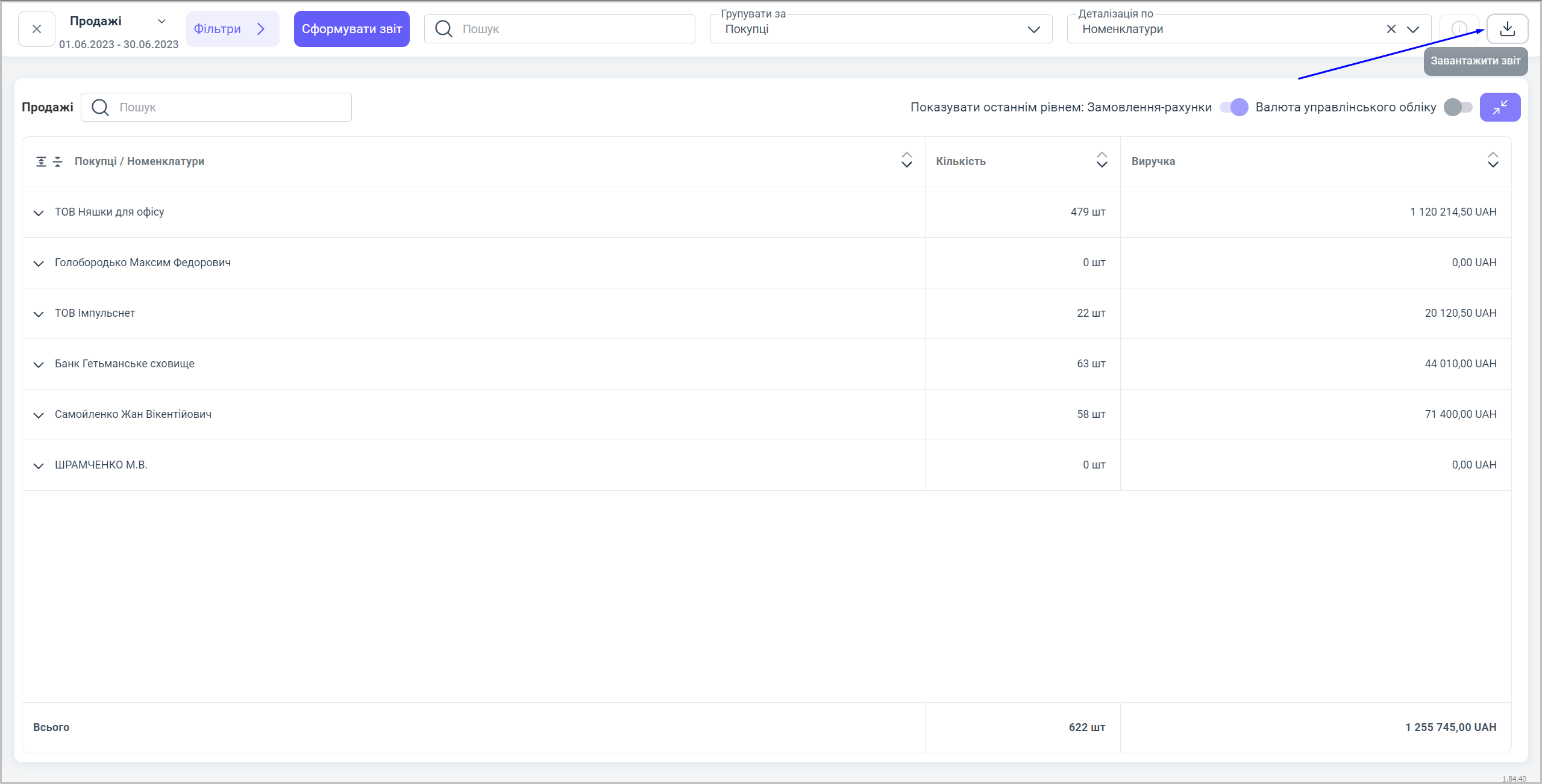 Після формування звіту ми можемо його вивантажити у файл Excel, за допомогою віджету "Завантажити звіт".