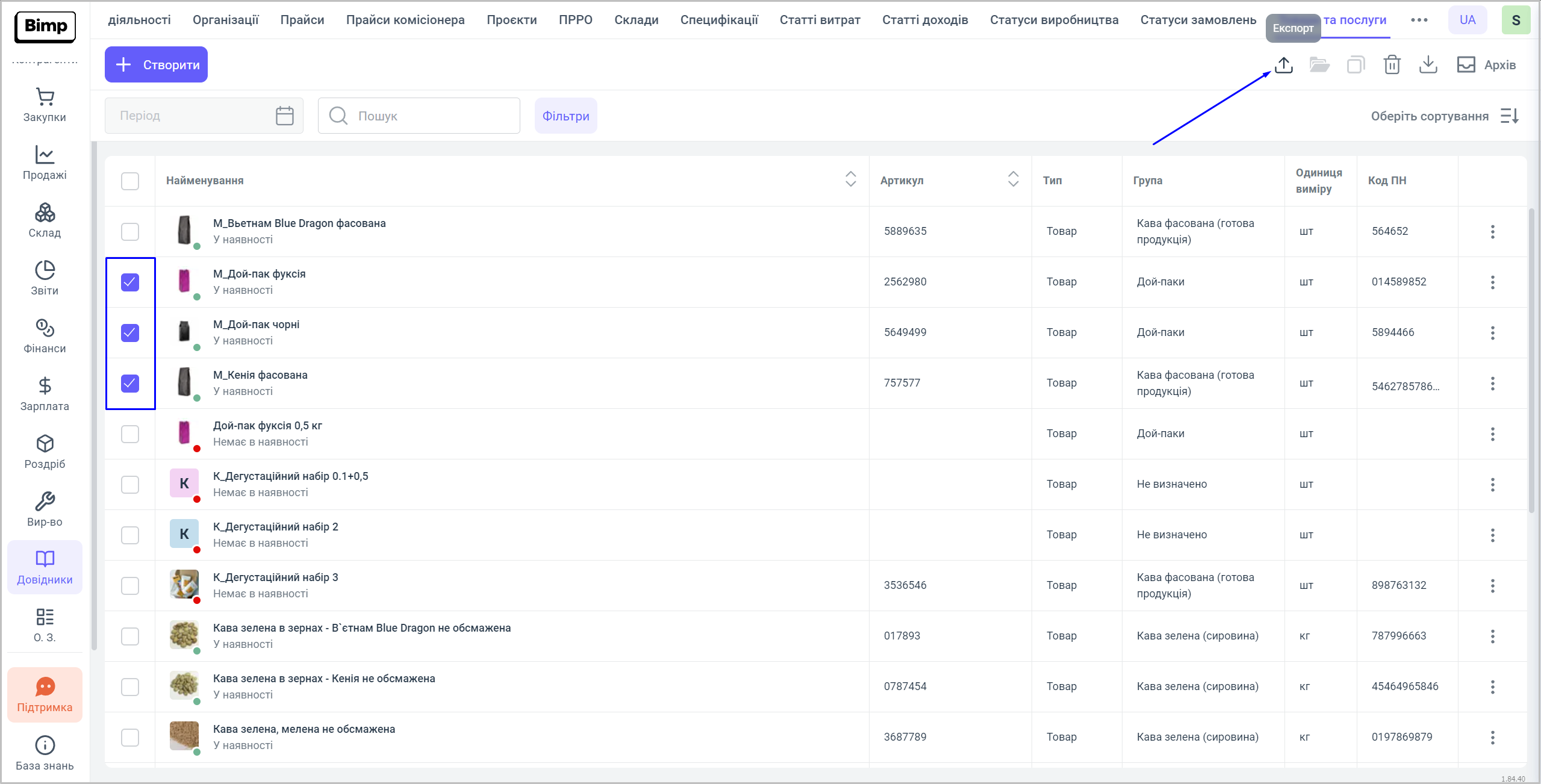 Необхідно перейти до блоку Довідники, розділ Товари та послуги, та відмітити галочками ті номенклатури, інформацію по котрому хочемо вивантажити до файлу