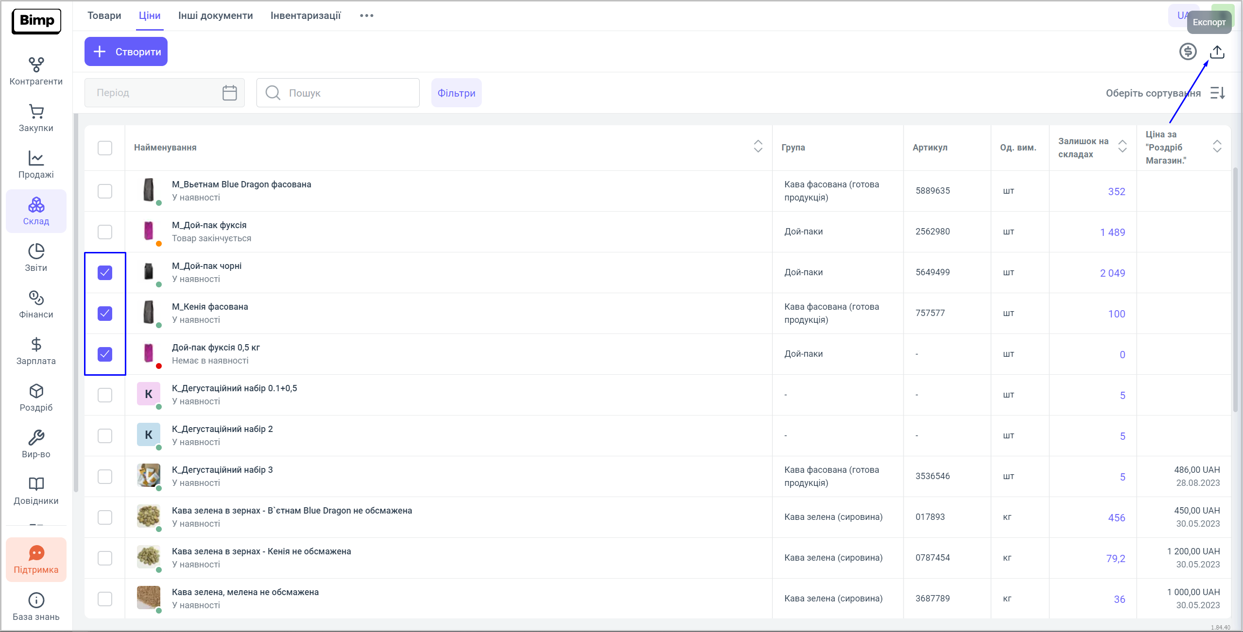 Необхідно перейти до блоку Склад, розділ Ціни, та відмітити галочками ті номенклатури, інформацію по котрому хочемо вивантажити до файлу