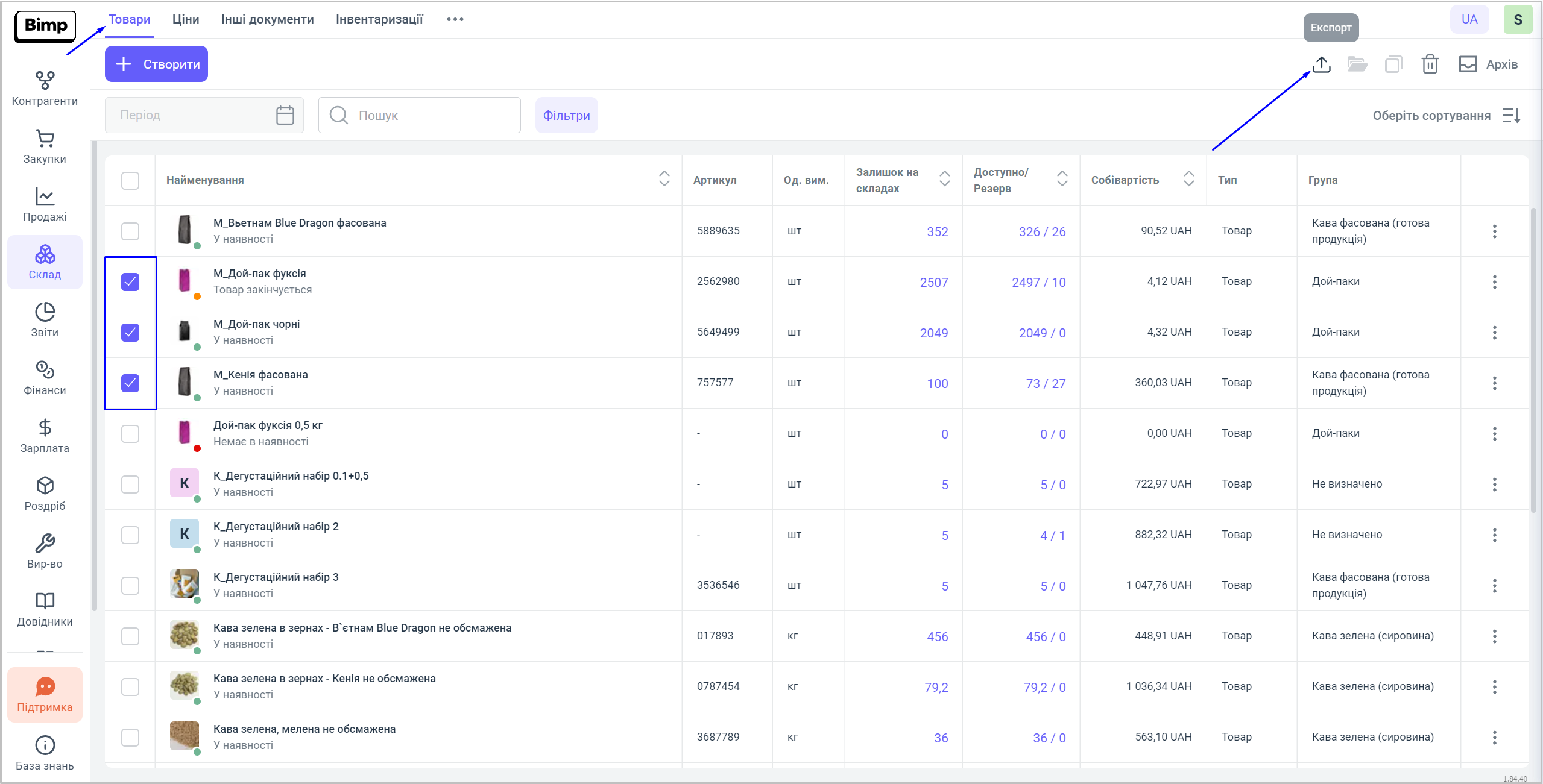 Необхідно перейти до блоку Склад, розділ Товрари, та відмітити галочками ті номенклатури, інформацію по котрому хочемо вивантажити до файлу
