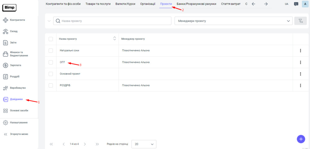 1. Переходимо в нашу компанію на сервіс Bimp в блок Довідники розділ Проєкти та відкриваємо Проєкт, котрий хочемо підв’язати до контрагента.