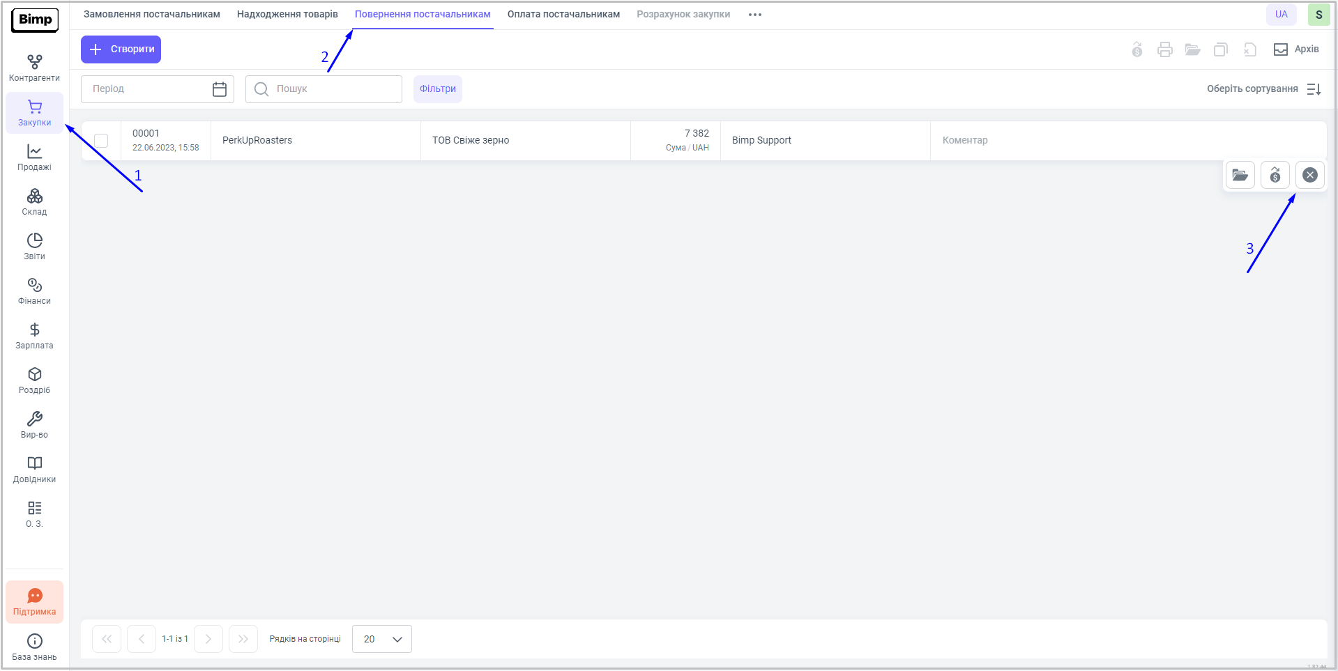 1. Переходимо в блок Закупки, розділ Повернення постачальникам  (скасування документів, також необхідно проводити, як і в блоці Контрагенти).