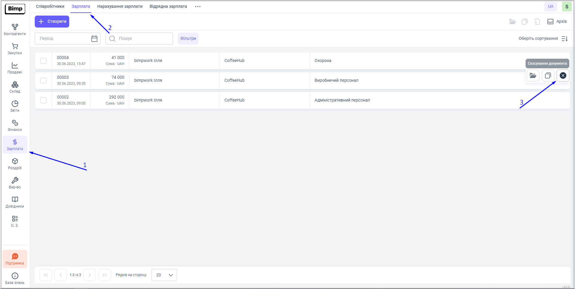 1. Перейти в необхідний блок (наприклад, блок Зарплата) навести курсор миші на документ, котрий хочемо скасувати.