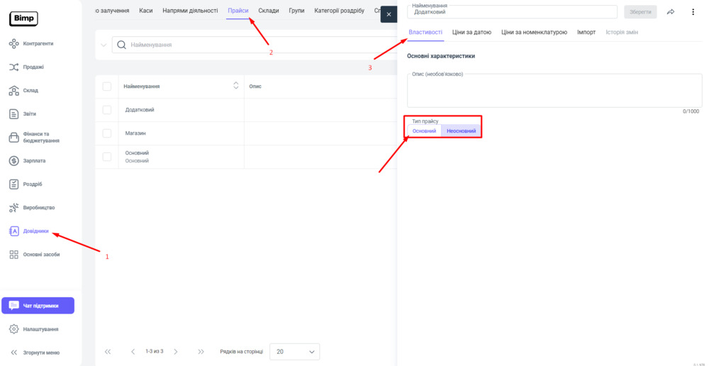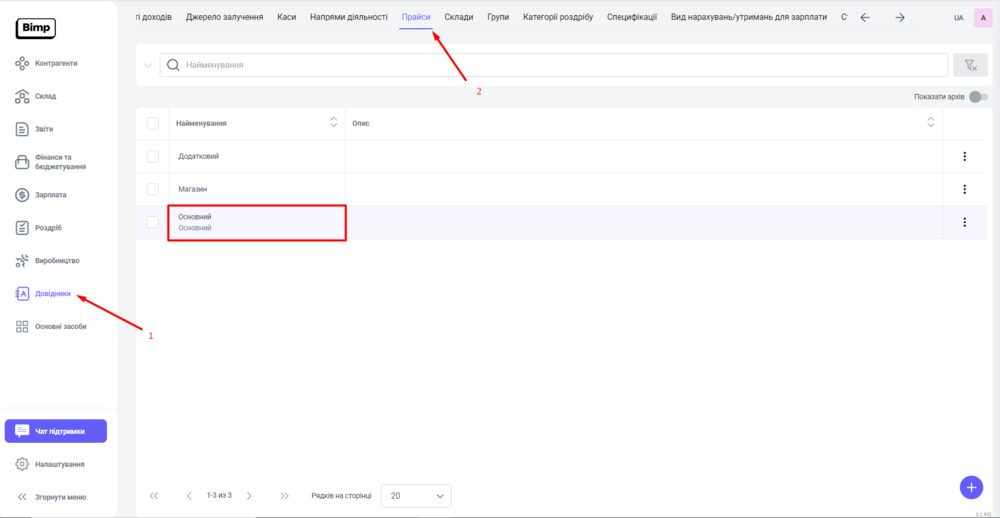 Переходимо до блоку Довідник, розділ Прайси. Бачимо, що ми маємо Основний прайс.