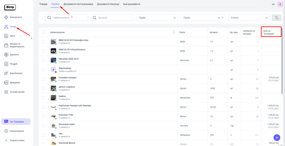 Переходимо до блоку Склад, розділ Прайси. Ми можемо бачити, що в цьому розділі у нас тягнуться прайси лише Основні. Ось чому нам такий важливий статус Основний, він тягне інформацію у прайси лише з основних.