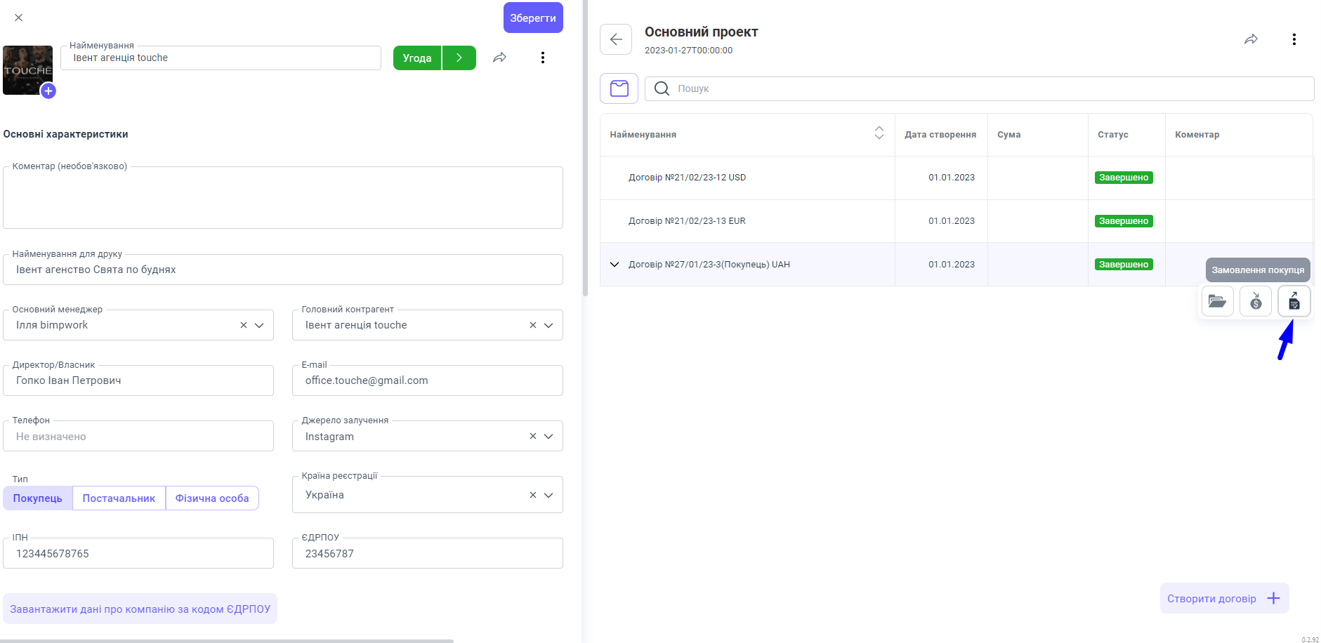 Переходимо до блоку Контрагенти, вибираємо необхідного контрагента (покупця чи постачальника), відкриваємо його картку. Вибираємо потрібний нам проєкт (у правій частині екрана).