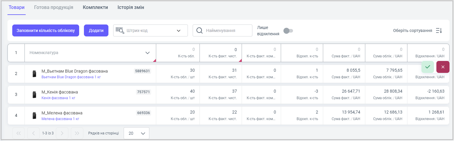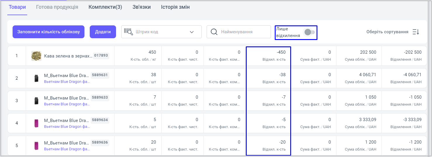 ВАЖЛИВО! При надлишку товарів значення в полях "Відхил. к-сть" та "Відхилення" будуть додатними, а при нестачі — від'ємними.