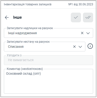 - Записувати надлишки на рахунок – обираємо на яку статтю доходів запишуться надлишки по складу;