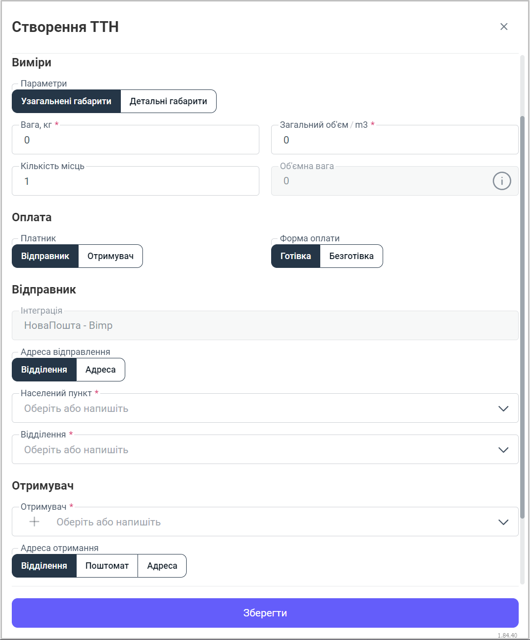Перед нами відкриється картка відправлення, яку необхідно наповнити інформацією про посилку та натискаємо Зберегти. Дана форма заповнюється аналогічно, як і форма створення накладної для посилок та вантажів, на сторінці Нової Пошті.