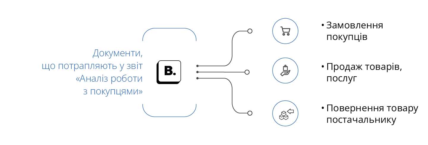 У звіт Аналіз роботи з покупцями потрапляють, такі документи сервісу - "Замовлення покупця", "Продаж товарів, послуг" та "Повернення товару від покупця".