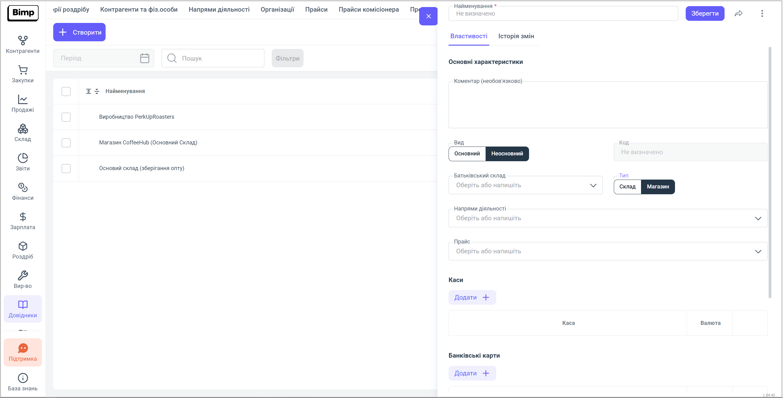 Довідник необхідний для створення складів та торгових точок вашої компанії, а також відображення їх переліку.