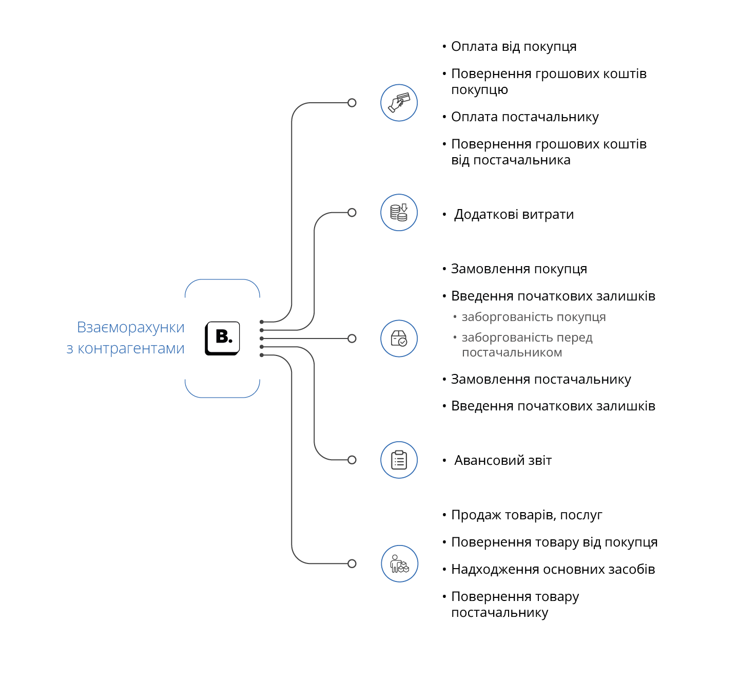 У звіт Взаєморозрахунки з контрагентами потрапляють, такі документи сервісу - "Оплата від покупця", "Повернення грошових коштів покупцю", "Замовлення покупця", "Введення початкових залишків", "Додаткові витрати", "Продаж товарів, послуг" "Повернення товару від покупця", "Замовлення постачальнику", "Надходження товарів, послуг", "Надходження основних засобів", "Повернення товару постачальнику", "Оплата постачальнику", "Повернення грошових коштів від постачальника" та "Авансовий звіт".