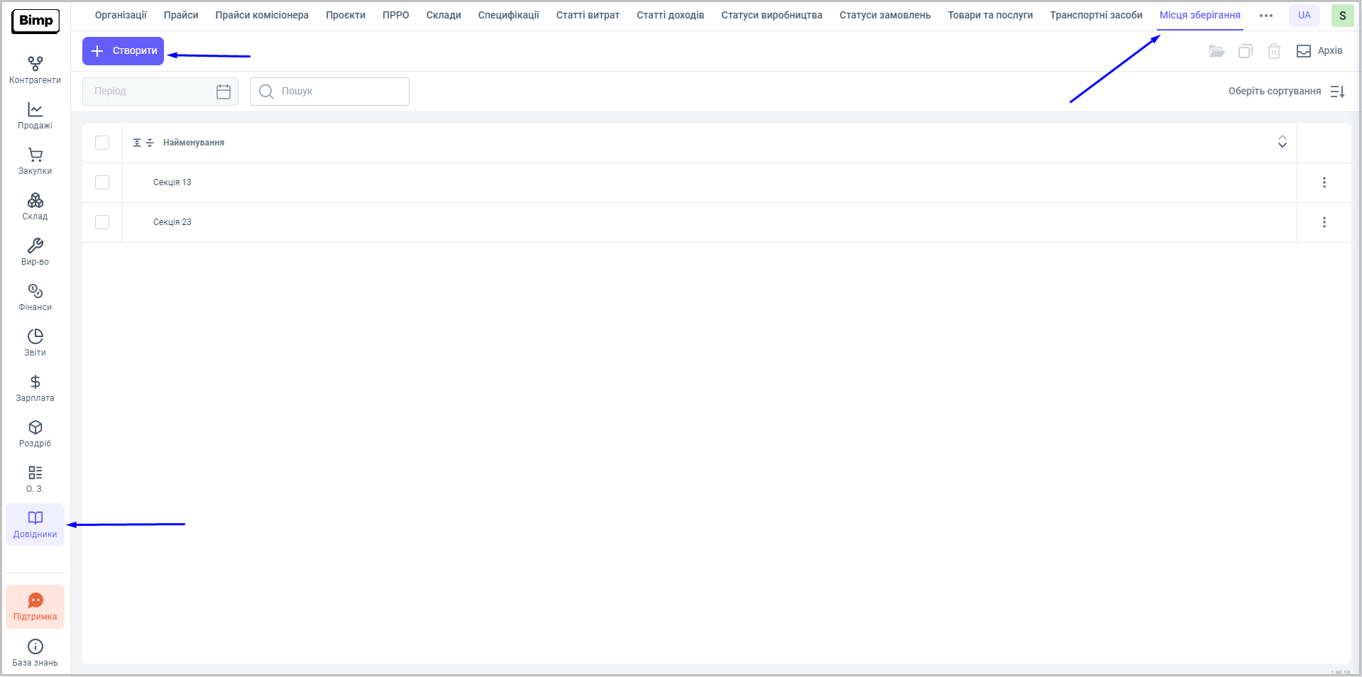 Нове місце зберігання можна додати вручну. Для цього необхідно натиснути кнопку “Створити” на робочому полі довідника.