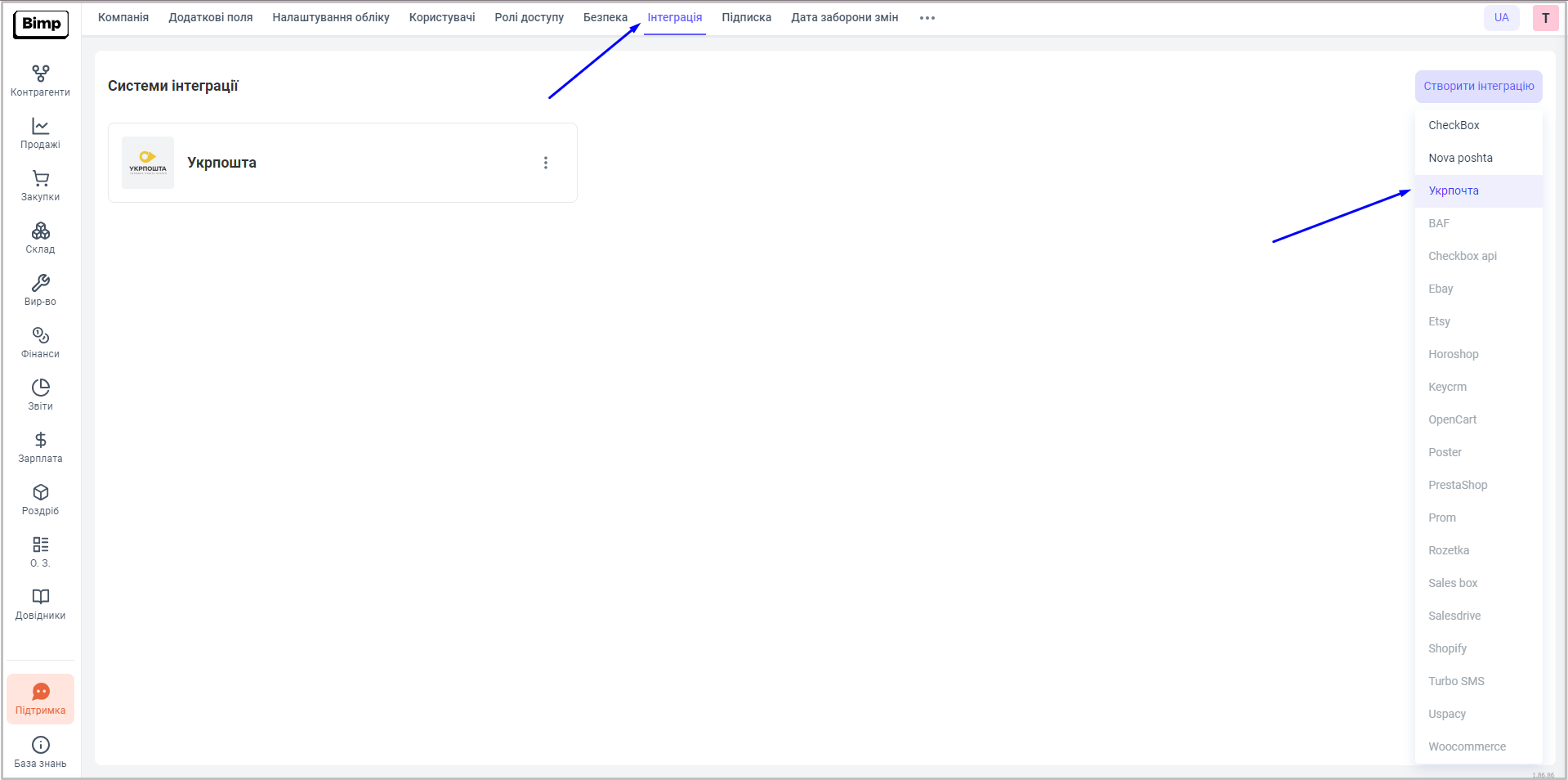 Як підключити інтеграцію з Укрпоштою, у сервісі Bimp?