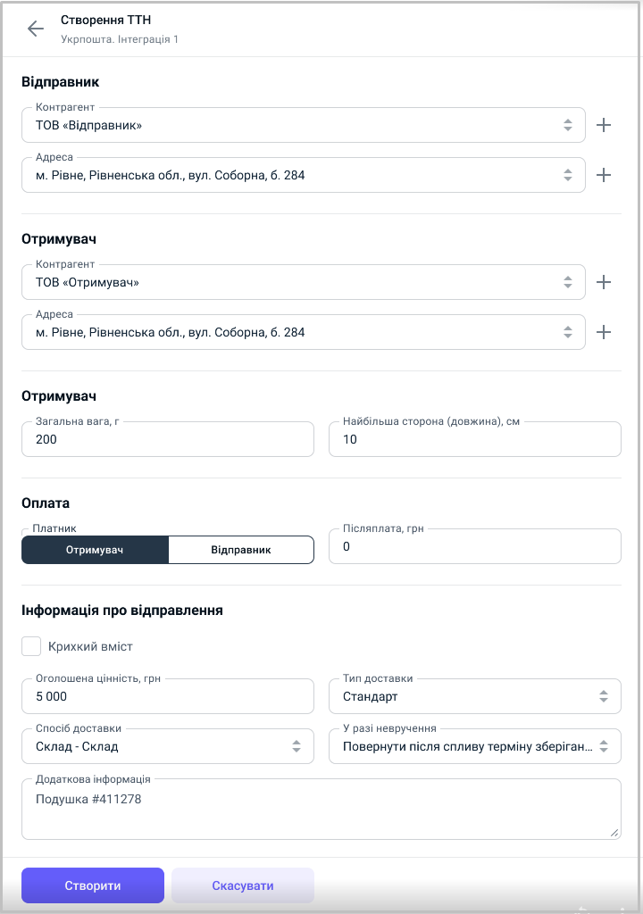 Коли наша інтеграція, з Укрпоштою, вже підключена, ми можемо перейти до створення ТТН на підставі Замовлення покупця.