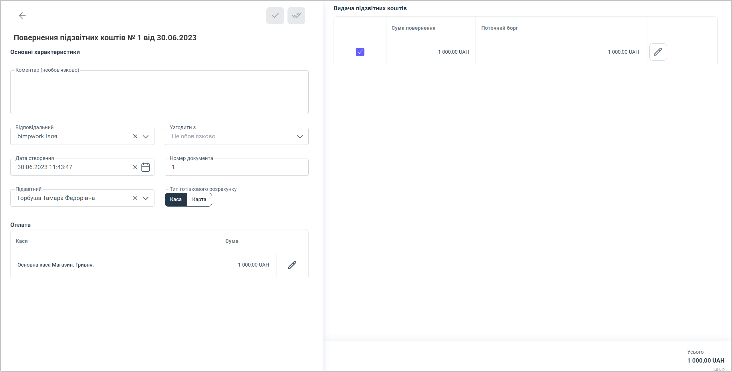 Переходимо в блок Фінанси розділ Розрахунки з підзвітними особами та натискаємо кнопку "+". Потім кнопку "Створити", та із випадаючого списку обираємо документ Повернення від підзвітного.