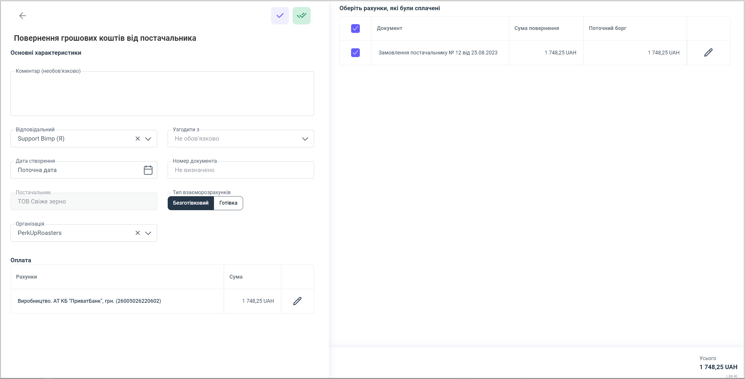 У праву частину документа "Повернення грошових коштів від постачальника", автоматично переноситься інформація з документа "Оплата постачальнику" або "Повернення постачальнику", залежить від того, на основі якого документа створено повернення