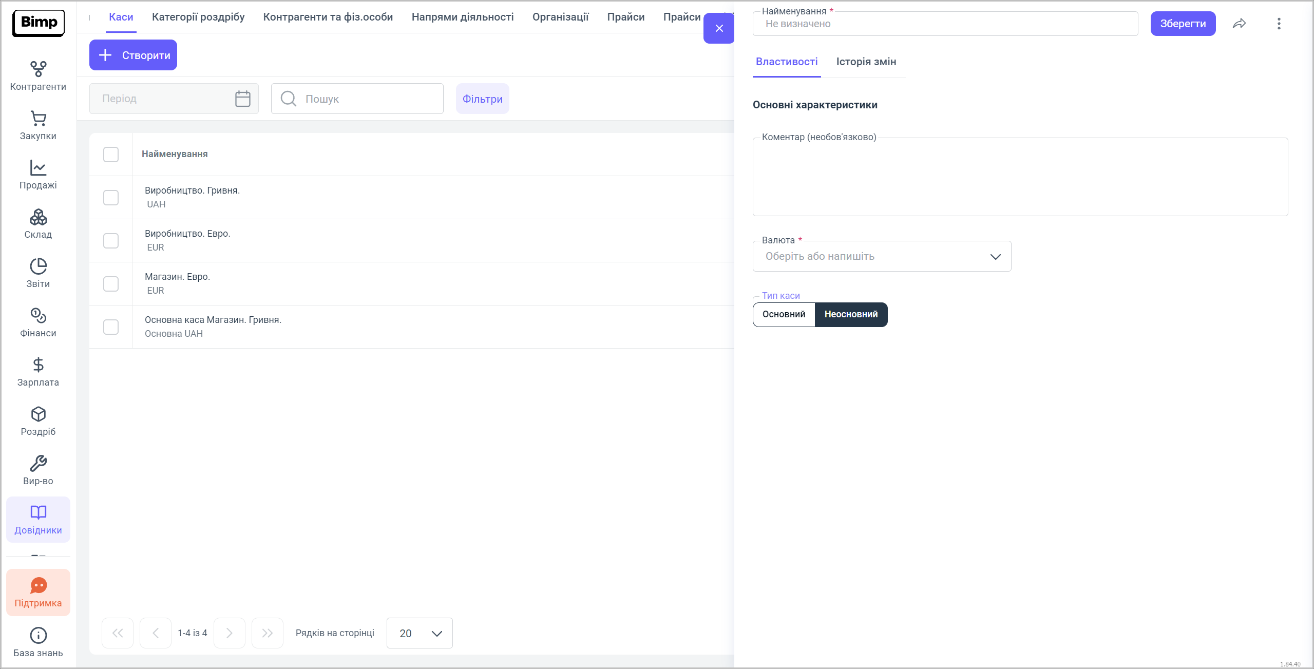 Нову касу можна додати вручну. Для цього необхідно відкрити блок Довідники, розділ Каси та натискаємо на кнопку “Створити” на робочому полі довідника.