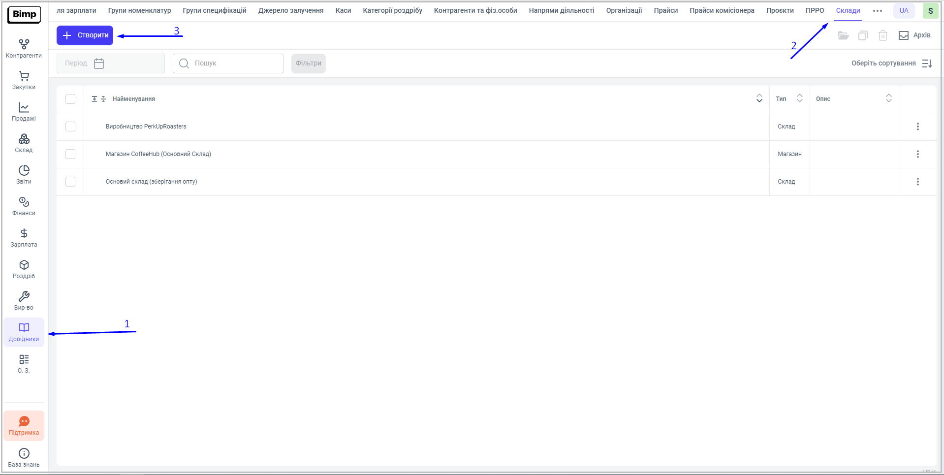 Необхідно перейти в блок Довідники розділ Склади та натиснути на кнопку "Створити".