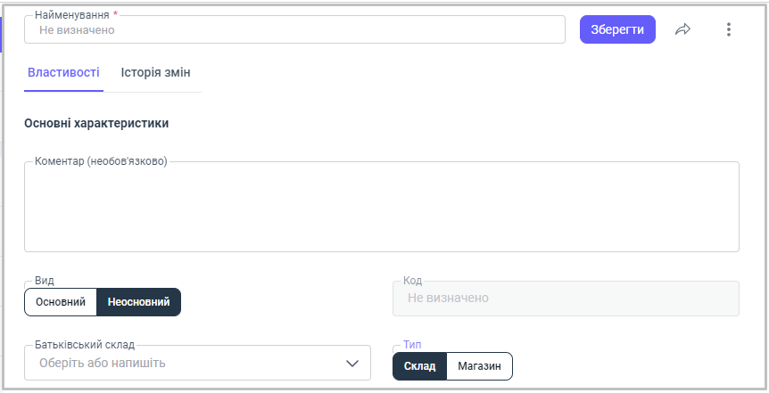 Перед нами відкривається робоче поле картки складу/торгової точки.