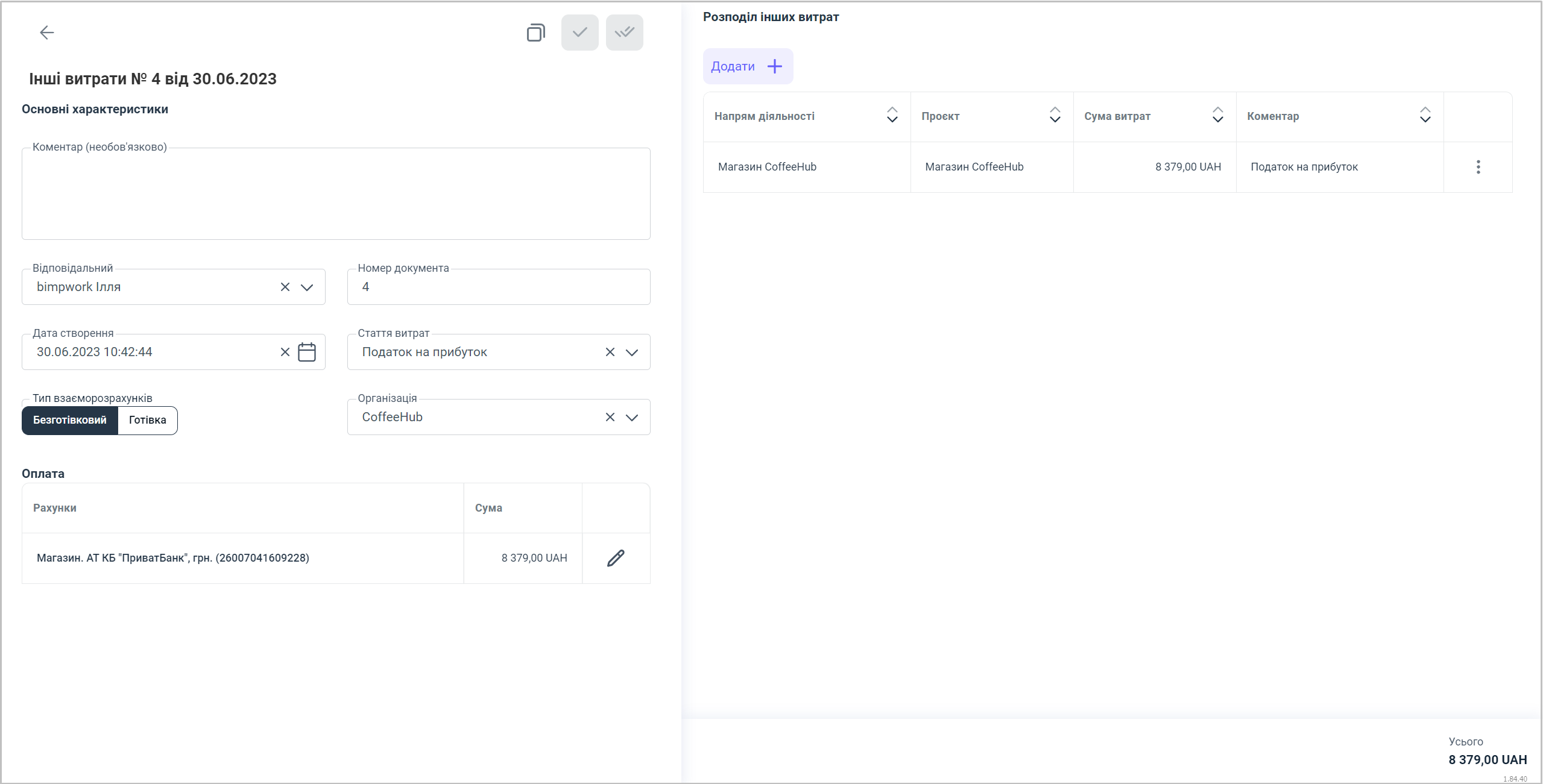 Розглянемо з прикладу проведеного документа Інші витрати. Дата створення = часу, зазначеному в стовпці виписки Час, стовпець Призначення платежу потрапляє до рядка Коментар (Не обов'язково). До правої частини документа вносимо дані вручну.