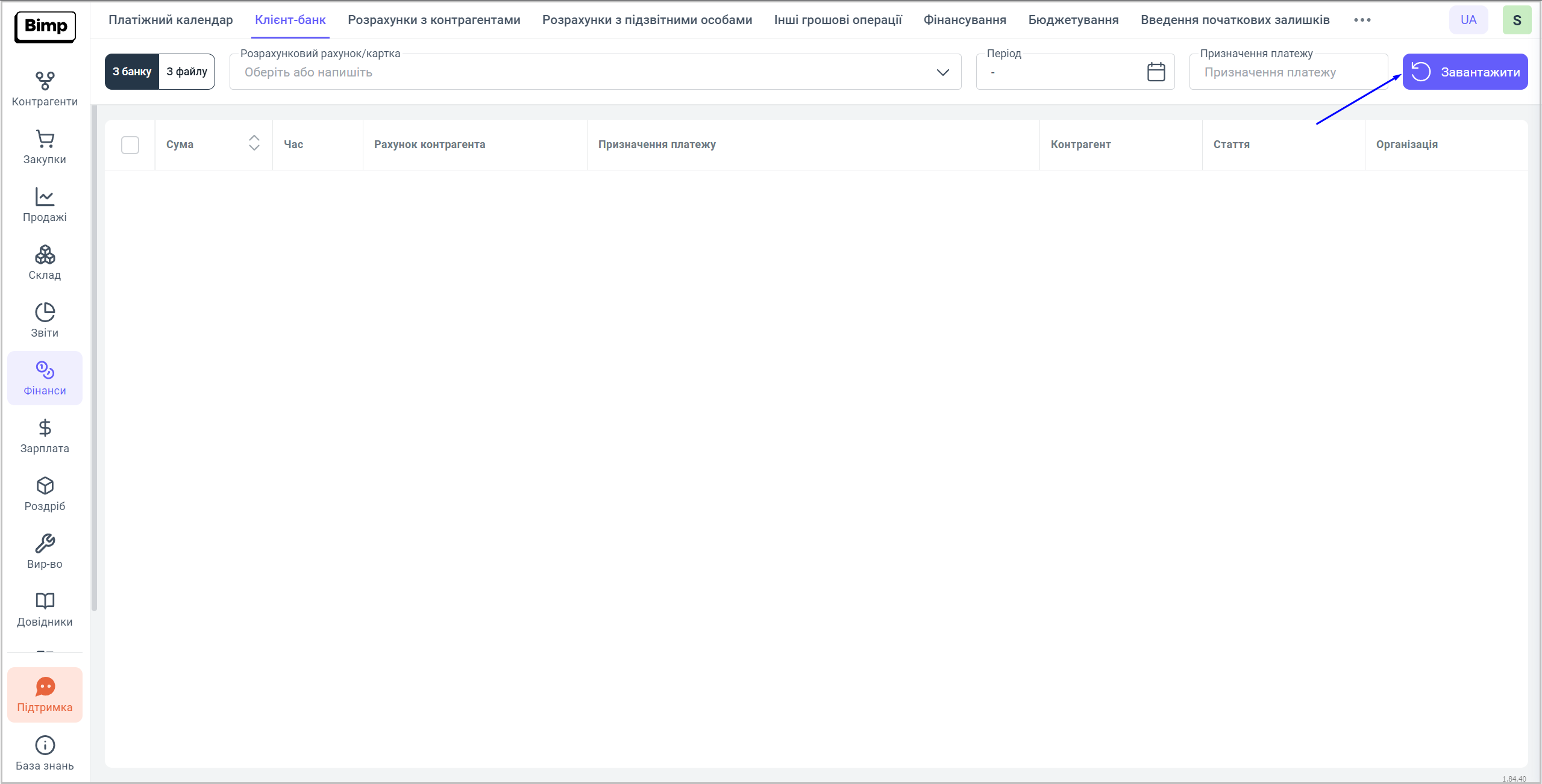 Переходимо до блоку Фінанси та бюджетування та обираємо розділ Клієнт-банк.