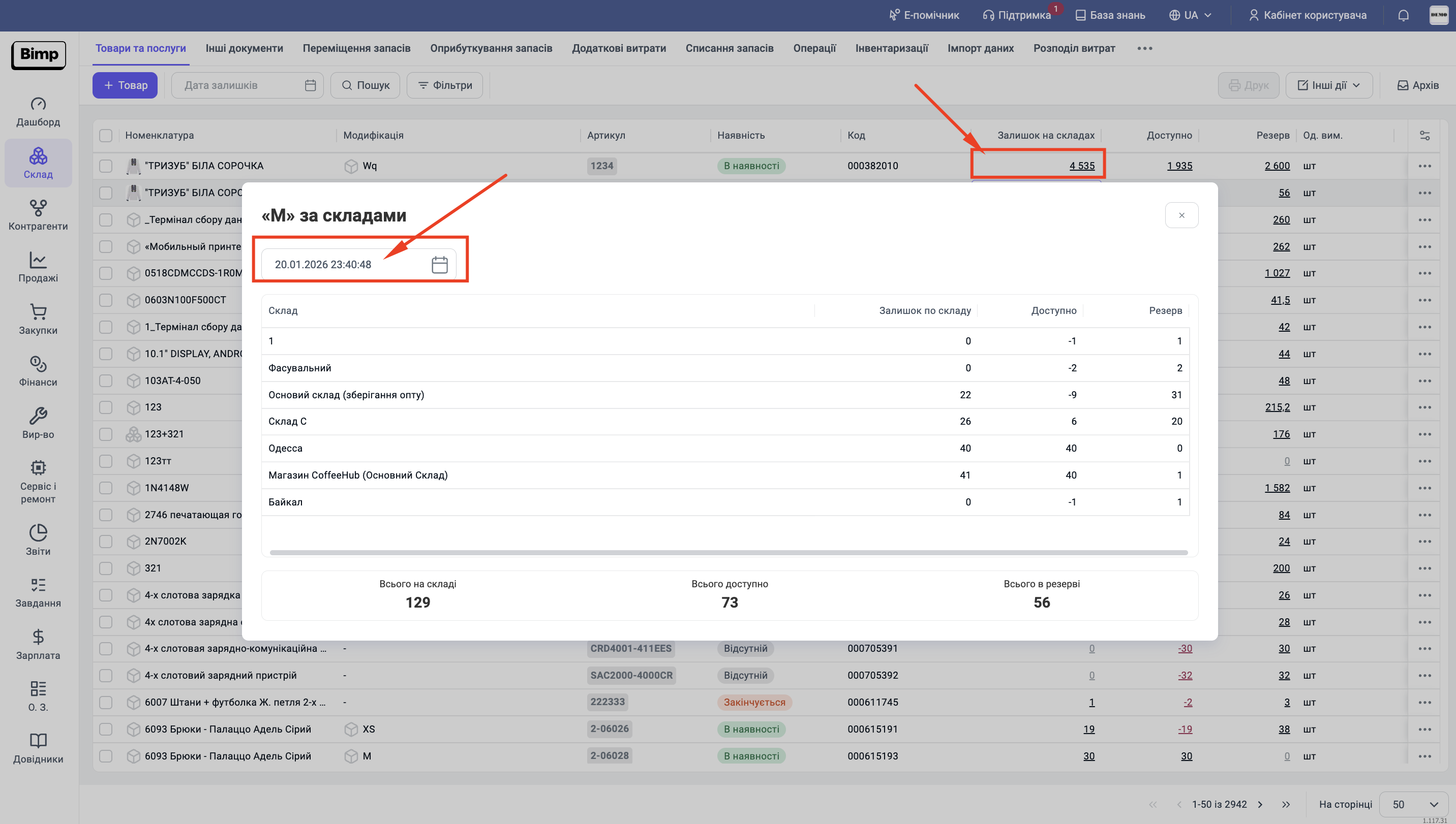 Система оновить дані й покаже реальний залишок та доступну кількість по кожному складу саме на вказаний вами момент. Якщо на вибраний час товару ще не було на балансі, ви побачите це у таблиці.