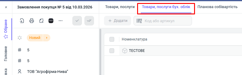 Перейдіть у вкладку "Товари, послуги бух. облік":