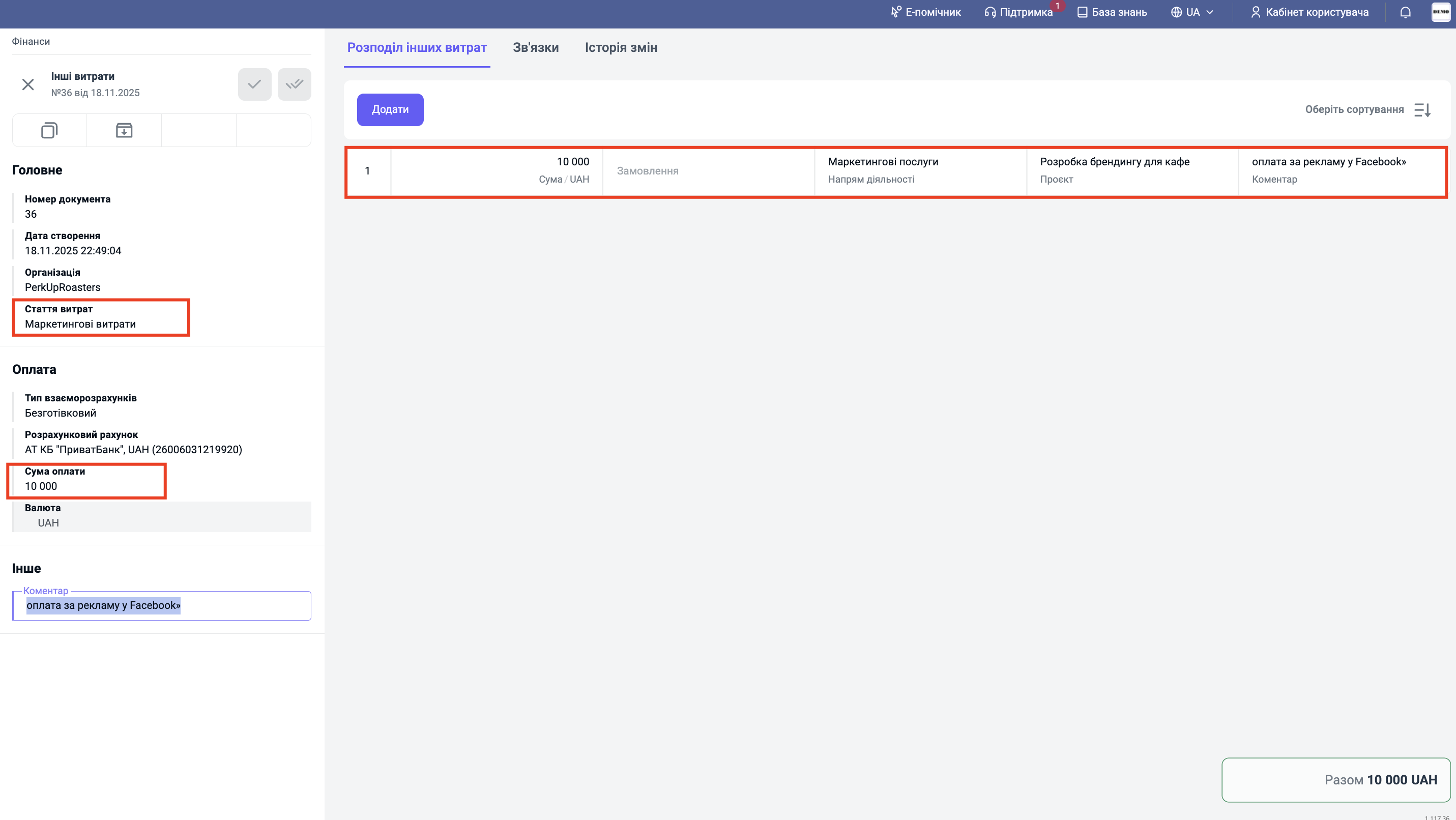 Компанія «Creative Mind» займається наданням послуг з графічного дизайну. У вересні 2025 року компанія оплатила послуги з налаштування таргетованої реклами (маркетинг) на суму 10 000 грн. Раніше ці дані велися в Excel і було важко зрозуміти ефективність окремих замовлень. Тепер при переході в ERP-систему BIMP адміністратору потрібно віднести ці витрати на проект «Розробка брендингу для кафе» та напрям діяльності «Маркетингові послуги» для розрахунку чистого прибутку.