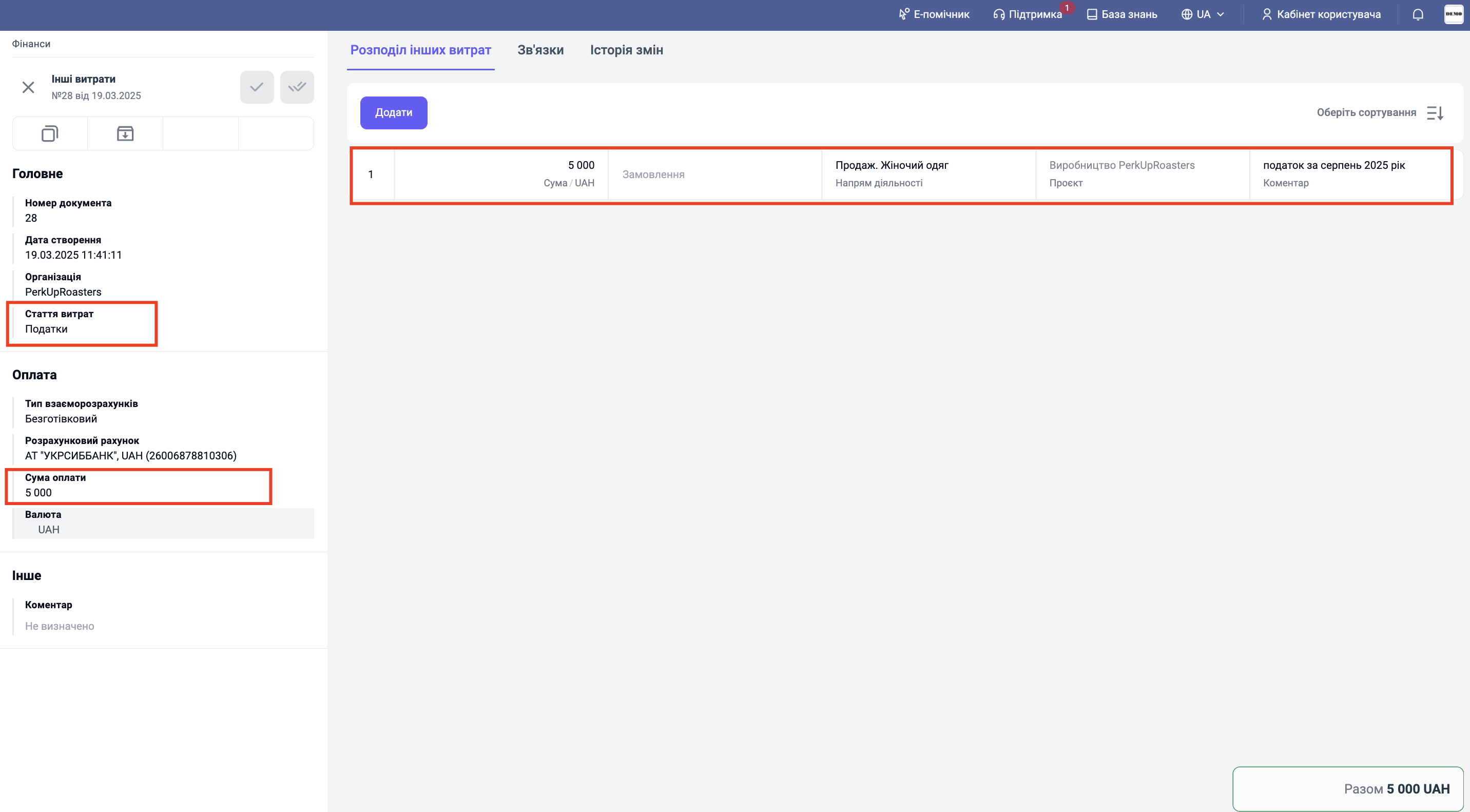Перейдіть до розділу фінансів та створіть документ «Інші витрати».