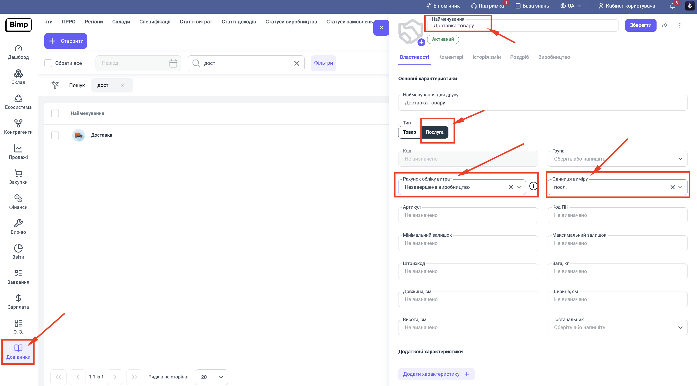У Bimp створіть номенклатуру з назвою "Доставка".