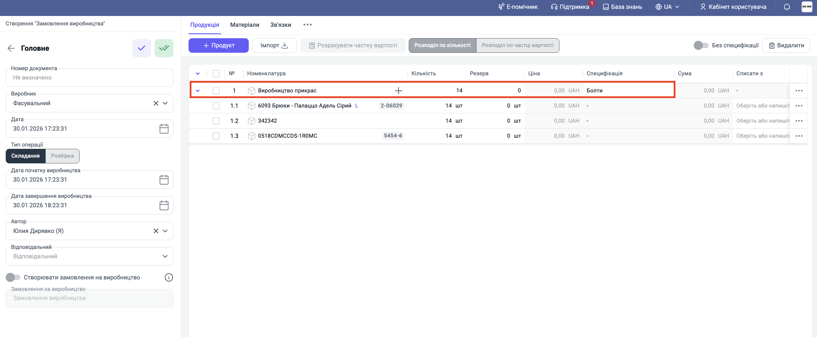 Після завантаження система автоматично заповнить табличну частину документа. Якщо назви специфікацій збіглися, ви побачите розгорнутий список матеріалів, необхідних для виробництва вказаної кількості товару.
