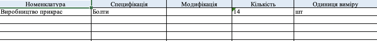 Специфікація: Назва конкретної специфікації, що прив'язана до цього виробу (наприклад, "Болти").