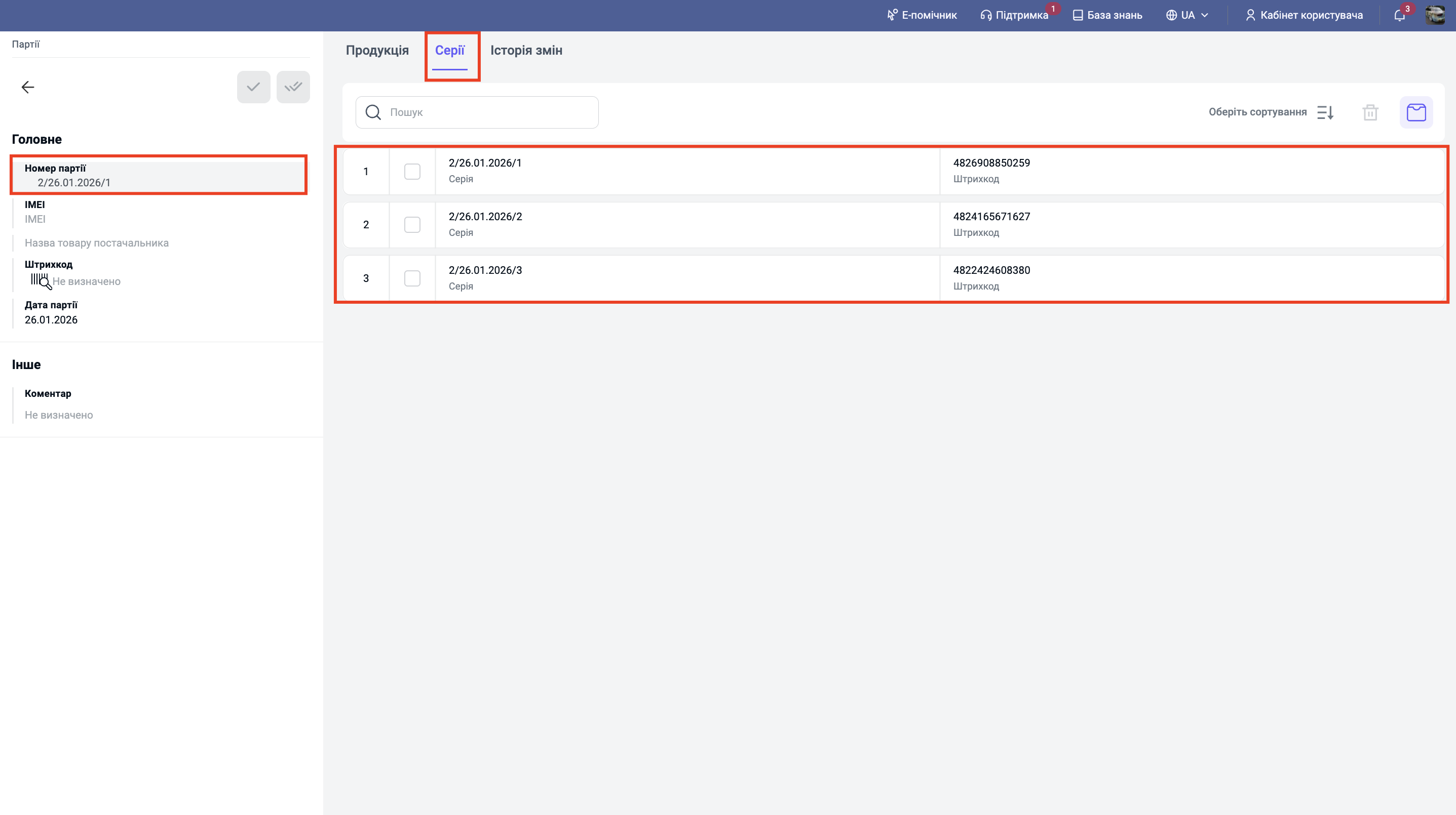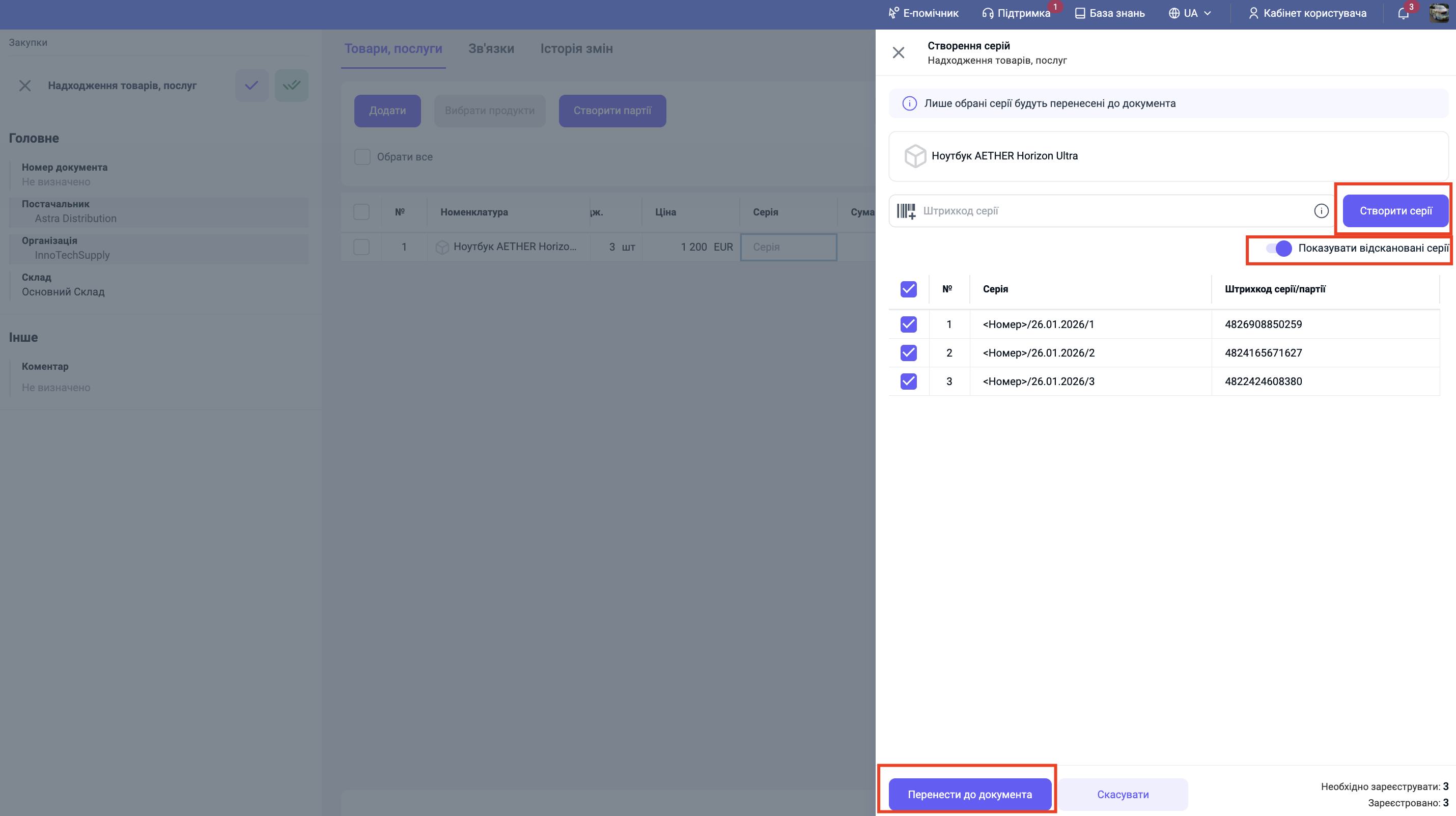 Після перенесення всі серії будуть відображені в документі та закріплені за цією партією товару.