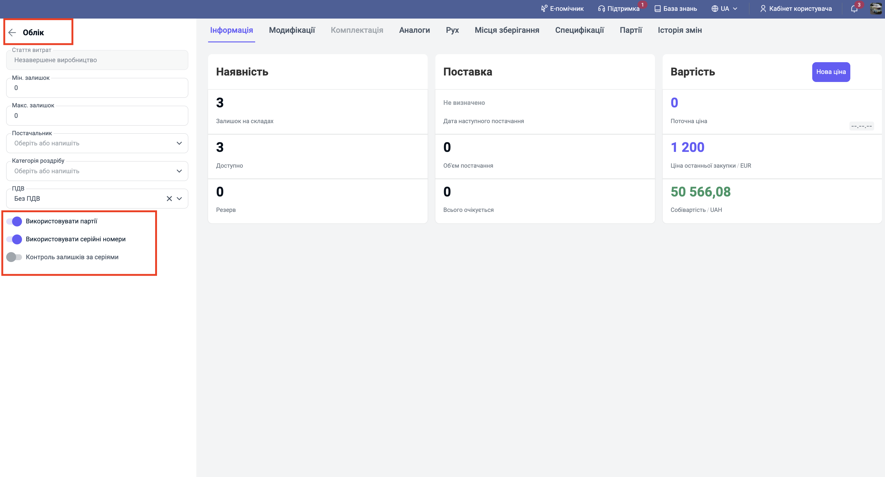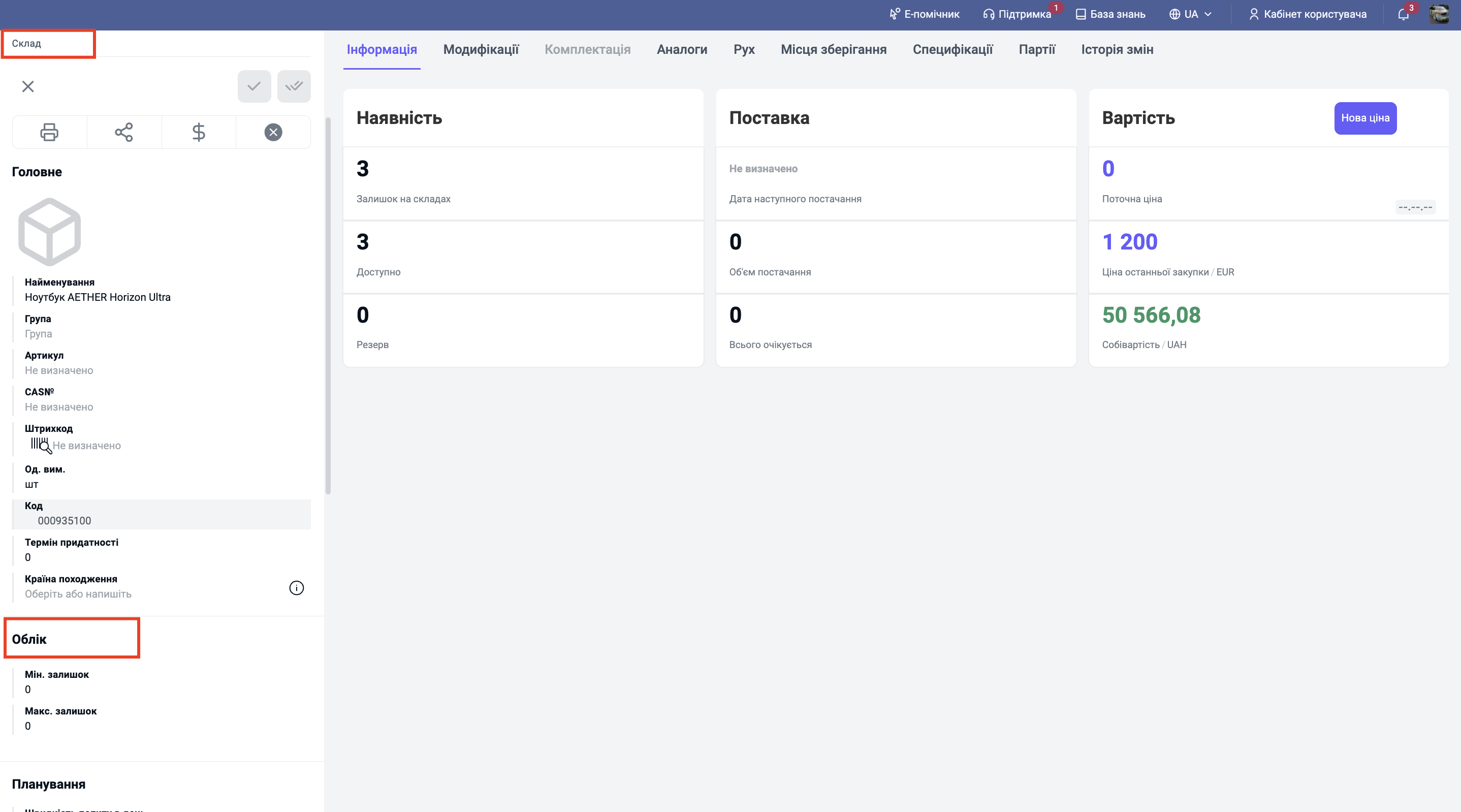 У картці товару натисніть на розділ "Облік" у лівому бічному меню.